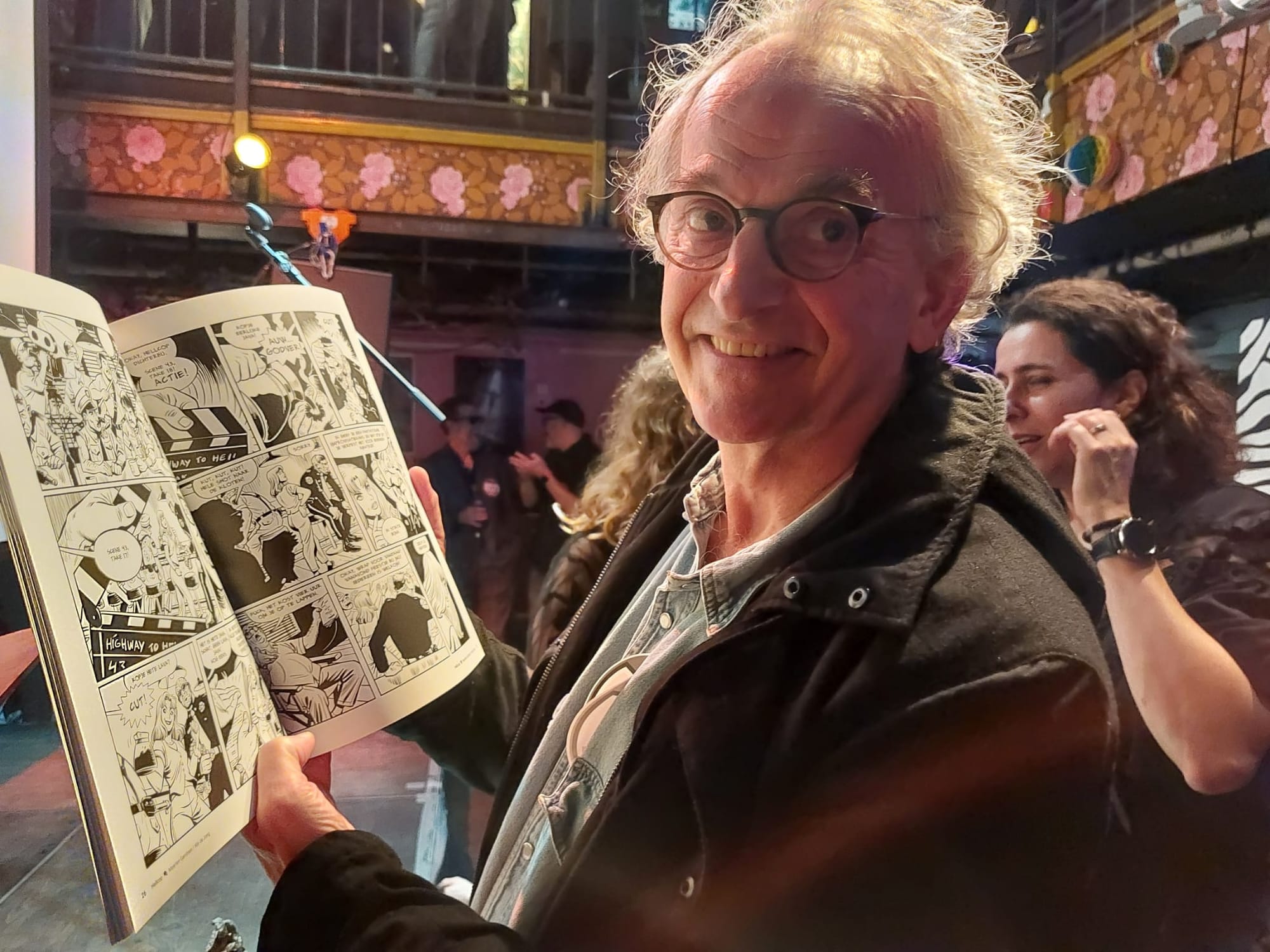We worden verwelkomd met een reageerbuisje met bloedwijn, en voor de liefhebbers zijn er cocktails en plaktattoos in bloeddorstige stijl. In de kelder wacht de horrorcomic om ontketend te worden, terwijl de DJ duistere deuntjes draait. Totdat regisseur Martin Koolhoven (Brimstone) het podium opstapt.