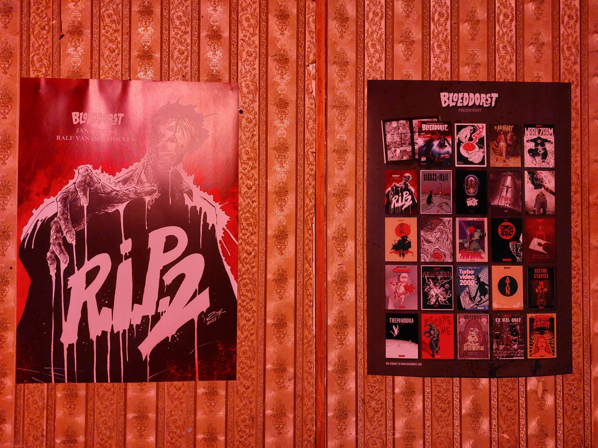 Als we binnentreden bij café De Nieuwe Anita zit de sfeer er al goed in. Overal hangen mismaakte knuffeltjes, gruwelijke originele prints van de deelnemende stripmakers en tegeltjes met Crowdfunding-comments aan de muur. Het café staat vol donateurs, artiesten en horrorfans met een verwachtingsvolle grijns op hun gezicht en een biertje in hun hand.