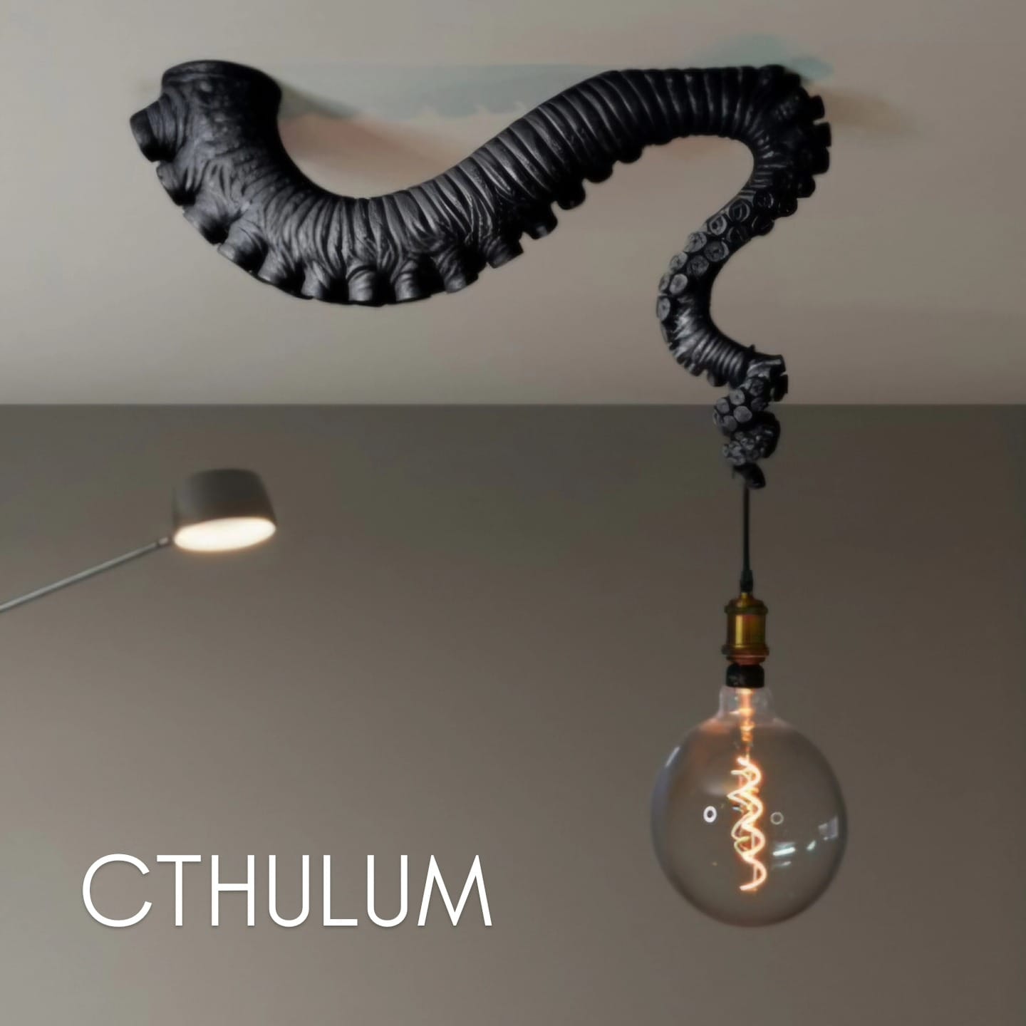 De CTHULUM-lampen zijn zo ontworpen dat het net lijkt alsof je onder het monsterlijke gedrocht Cthulhu zelf zit. Een tentakel komt uit jouw plafond en kronkelt zich een weg tot ongeveer boven je tafel. Aan het eind hangt dan een grote lamp, die jouw donkere dagen komt verlichten.