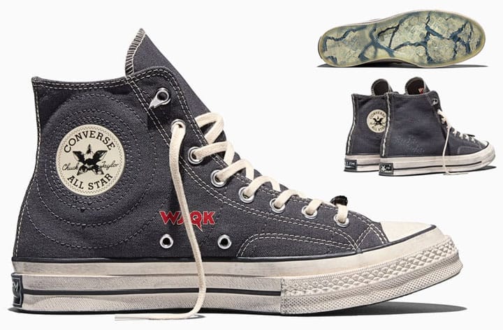 De Chuck 70 heeft verweerd canvas met WSQK-graphics, geborduurde geluidsgolven en een “Beam Me Up, This Place Sucks”-voering als knipoog naar Robins T-shirt. De Converse Weapon verschijnt in de kleurstelling gebaseerd op de 1984-versie in een vintage look.