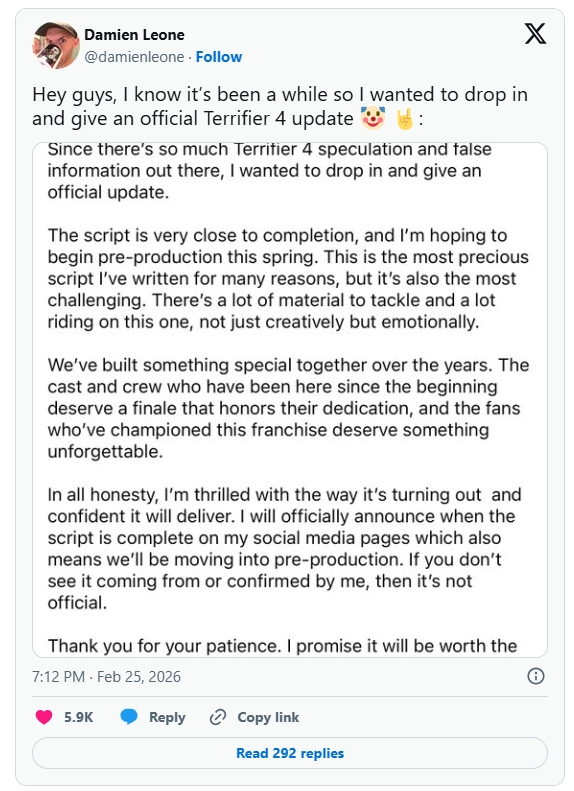 Leone postte de update op X (Twitter). Hierin benadrukt hij dat dit vierde deel het meest “kostbare en uitdagende” script is dat hij ooit schreef en dat officiële aankondigingen alleen via zijn eigen kanalen komen. Daarmee reageert hij op de stroom nepgeruchten over Terrifier 4.